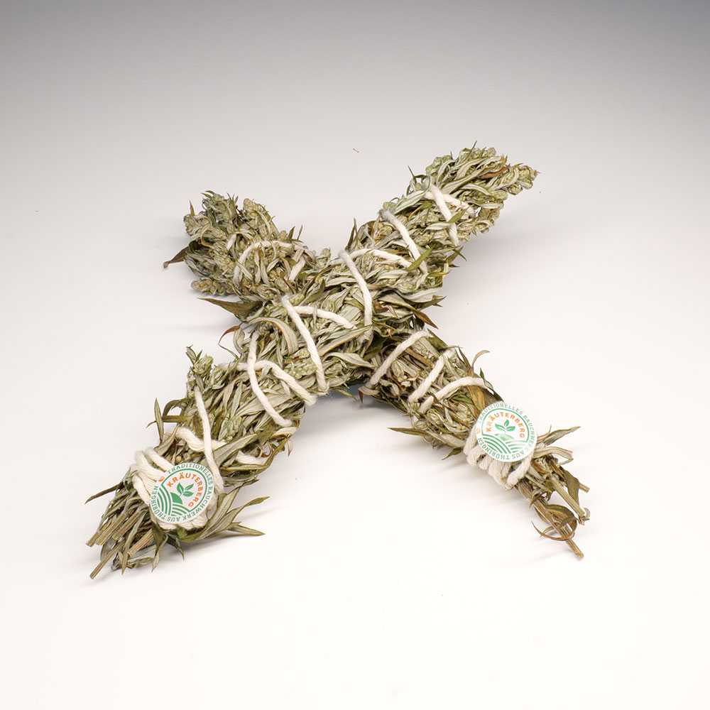 Inhalt: Räucherbündel mit Steppenbeifuß, dreifarbigen oder einjährigen Beifuß (variabel mit Salbei, Königskerze und Lavendel)