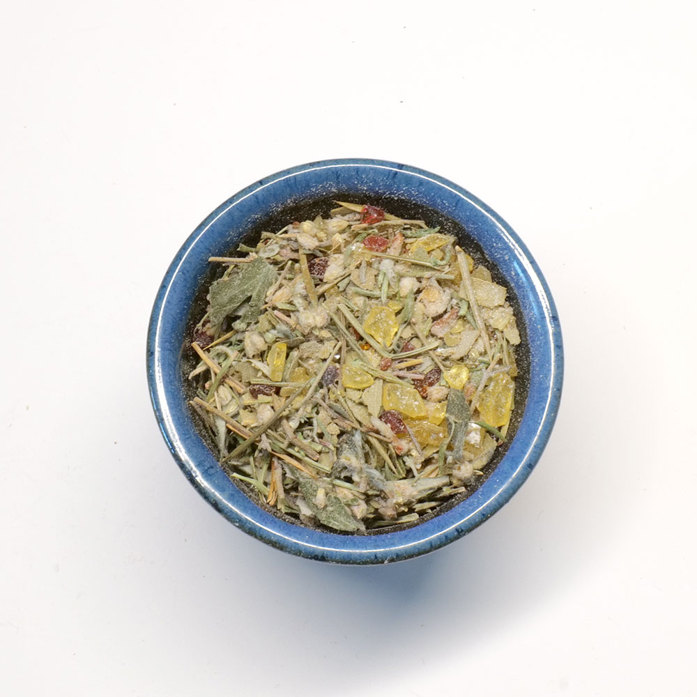 Inhalt: Kiefernharz, Kieferngrün (Nadeln), Bernstein, Beifußkraut, Baldrianwurzel, Thymian, Lorbeerblätter, Wacholderbeeren (Weiheicheln, Knistebeeren, Heilige Beeren), Wacholderspitzen